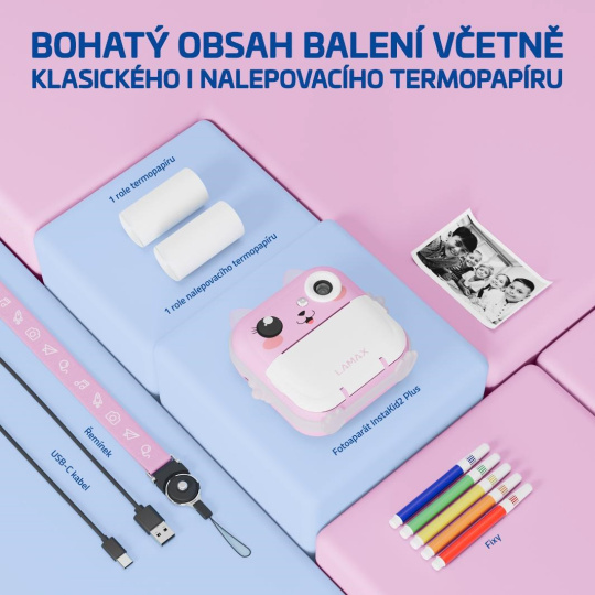 Objavte kúzlo zachytených momentov, ktoré si vaše deti vytlačia počas pár sekúnd. Detský fotoaparát LAMAX InstaKid2 Plus s okamžitým tlačom nie je len roztomilý na pohľad. S českou aplikáciou, vysokým rozlíšením fotiek aj videa a sadou kreatívnych nástrojov sa stáva zábavným parťákom na výlety i do izbičky. Deti si s ním nielen vyfotí svoje zážitky, ale hneď si ich aj vytlačia, vymaľujú priloženými fixkami a nalepia do denníka alebo kamkoľvek budú chcieť. Pomocou aplikácie potom zvládnu tlačiť fotky a poznámky z telefónu, skenovať texty zo zošitov, prekladať snímky do animovaného štýlu alebo si s pomocou AI vymaľovať čiernobiele obrázky. A keď si od fotenia chcú na chvíľu oddýchnuť? O zábavu sa postarajú aj vestavné hry.LAMAX InstaKid2 Plus fotoaparát podporuje kreativitu, samostatnosť i hravé učenie a kto vie, možno práve tento foťák odštartuje kariéru vášho dieťaťa vo svete fotografií a filmu.