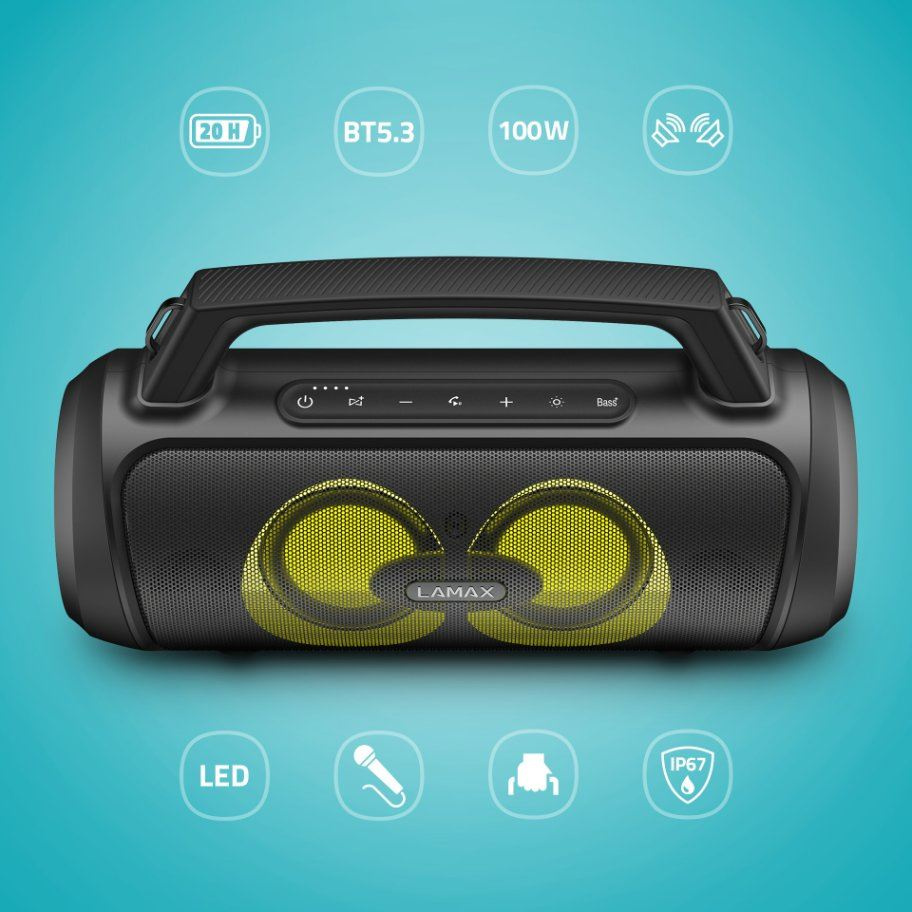 LAMAX PartyGo1 sa nezdá, ale ukrýva v sebe výkon o veľkosti 100 W, čo rozohrá každú párty na maximum. Pokiaľ ti to nestačí, využi funkciu TWS a pripoj ďalší PartyGo1 a výkon si zdvojnásob!