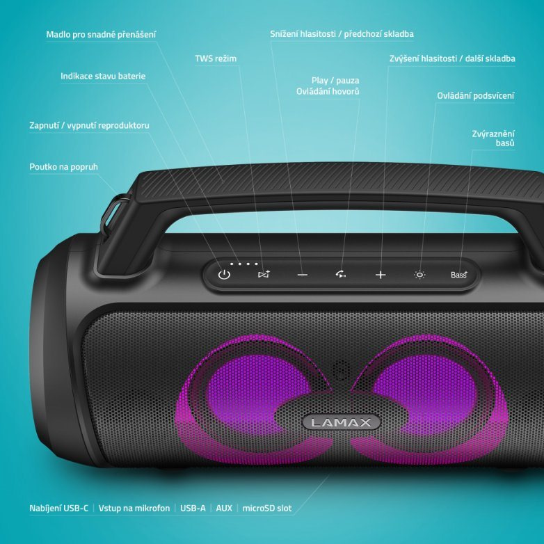 ticle id="description_lamax_2019-11-19" class="description-lamax-turquoise"> LAMAX PartyGo1 Malé telo s veľkým výkonom Rozbehni kdekoľvek aj neplánovanú párty vo veľkom štýle. Prenosný párty reproduktor LAMAX PartyGo1 je vzhľadom malý, ale ukrýva v sebe veľkú silu, výkon 100 W. Technológia BeatBass® mu dá... viac