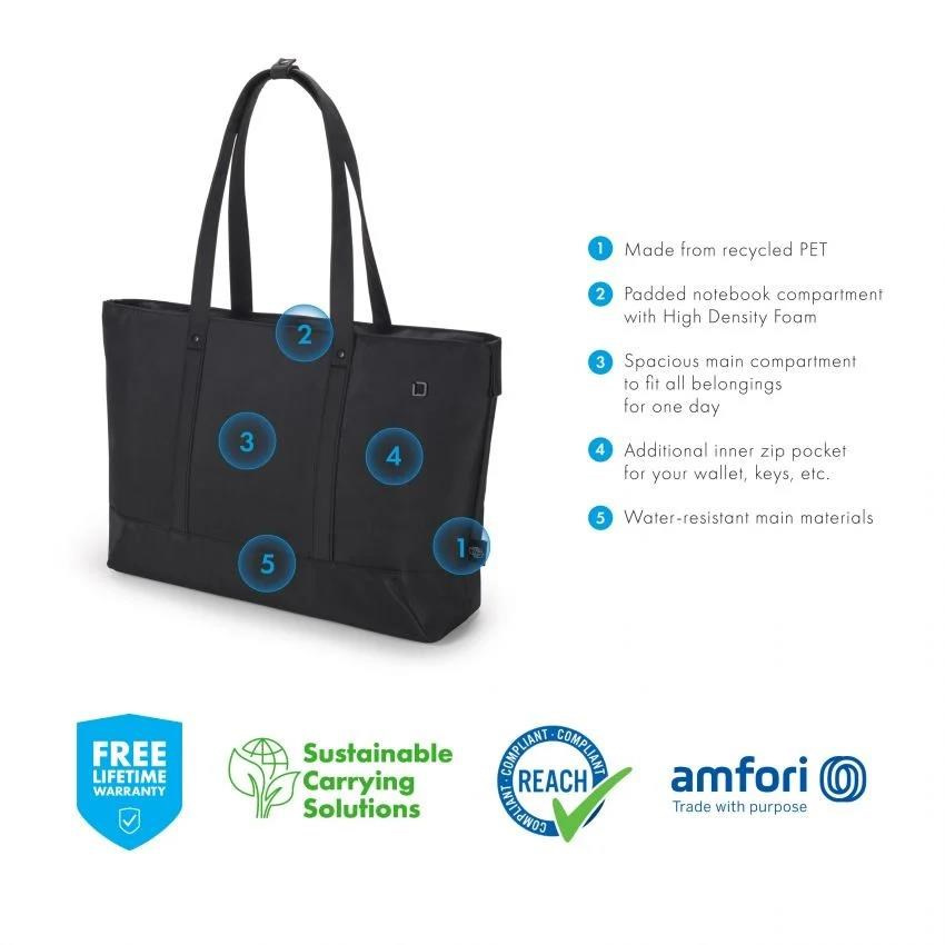 Laptop Shopper Bag Eco MOTION 13 - 14.1" Lightweight, spacious and versatile Today's actions shape tomorrow's world. Which is why, here at DICOTA, we are dedicated to developing environmentally friendly solutions and therefore make all the items in our ECO collections out of sustainable, recycled PET. We reuse up to 36 PET bottles, so you will receive an environmentally friendly product with a life-long guarantee. Our PET products also have the quality, look and finish that you know and love. Specifications Art.no.: D31977-RPET EAN: 7640186417426 Weight: 0.6 kg Material: 600D RPET Polyester Warranty: Lifetime / 30 years Dimension: 520 x 320 x 125 mm Max. Device dimensions: 350 x 245 x 25 mm Characteristics • Made of 9 recycled PET bottles • Padded notebook compartment with High Density Foam • Spacious main compartment to fit all belongings for one day • Zippered compartment with storage space for mobile accessories • Additional inner zip pocket for your wallet, keys, etc. • Water-repellent material • Available in two colours