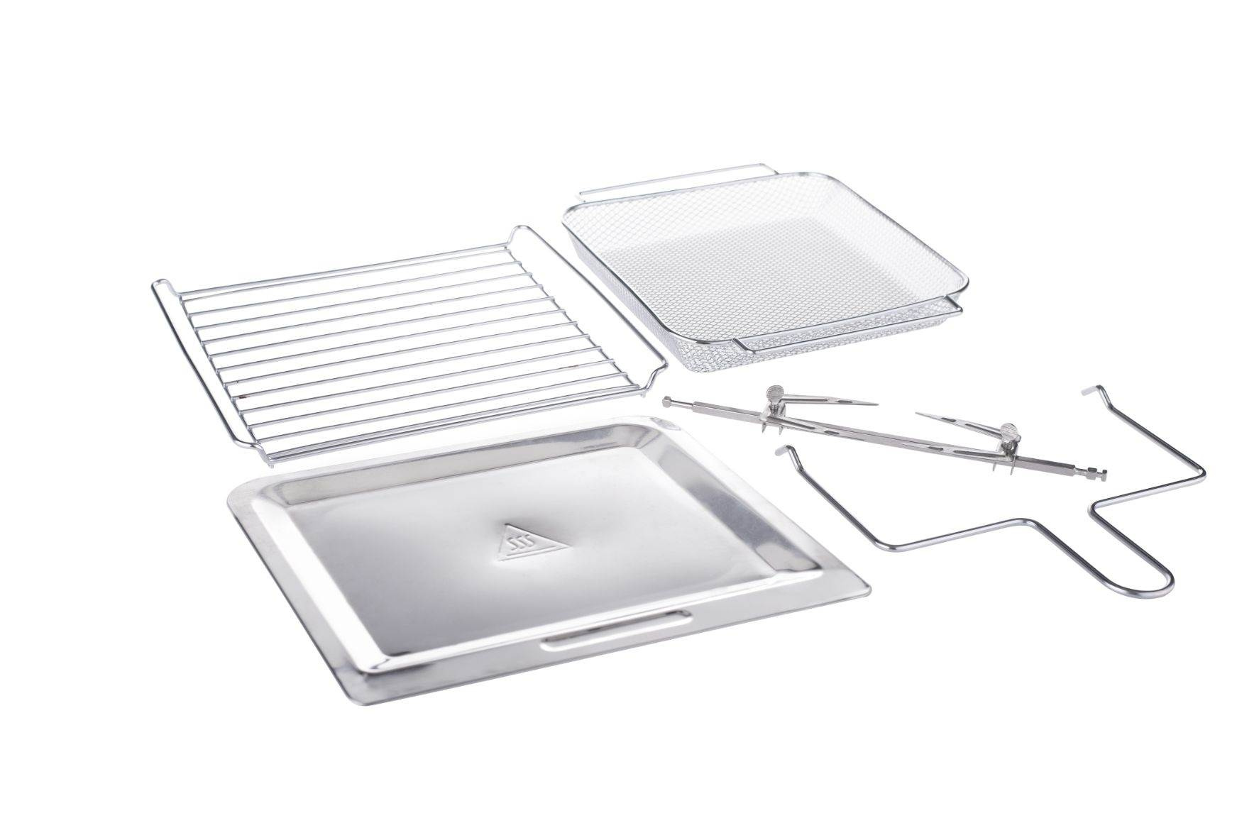 1 klasická mriežka na plech alebo rôzne formy, 1 rotačný kôš na hranolky, 1 hlbšia mriežka na pečenie kuracích krídiel, zemiakov, 1 plochá mriežka na sušenie ovocia či hríbov, 1 odkvapkávací plech, ktorý zachytáva tuk a olej, ihla na grilovanie celého kuraťa, úchyt.
