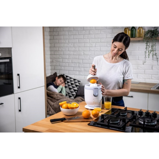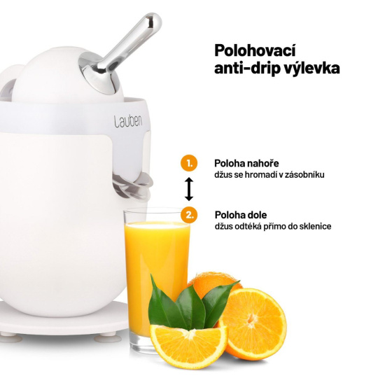 Šťava plná vitamínov jednoducho a rýchloZástancovia zdravého životného štýlu by vo svojej domácnosti nemali chýbať pomocník v podobe elektrického citrusovača Lauben Electric Citrus Juicer 110WT. Jeho čistý dizajn ozdobí každú kuchynskú linku, ktorú vďaka funkcii Anti Drip nepoškvrní ani kvapkou šťavy. Funkcia proti odkvapkávaniu zabezpečuje, že džús prúdi priamo do pohára alebo zostáva v zásobníku. Rýchlosť otáčok pri odšťavovaní je nastavená tak, aby si šťava uchovala maximum vitamínov. Chuť navyše nie je nijak ovplyvnená, pretože časti prichádzajúce do kontaktu s ovocím sú nerezové alebo z plastu splňujúceho najprísnejšie nariadenia EÚ a neuvoľňujú žiadnu pachuť ani arómu. Tvar kužeľa a nastaviteľná páka proces odšťavovania zefektívňujú a tichý chod umožňuje prípravu džúsu hocikedy. Bezpečný chod zabezpečujú protisklzové nožičky a poistka znemožňujúca spustenie, ak lis nie je riadne zostavený. Určite poteší aj ľahká údržba, odnímateľné časti stačí vložiť do umývačky.