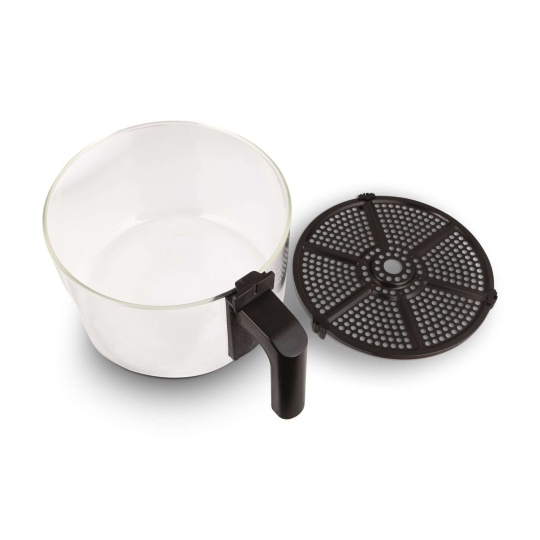 Unikátny fritovací kôš z vysokého borosilikátového sklá s 360° viditeľnosťou a vnútorným osvetlením poskytuje dokonalý prehľad o priebehu prípravy pokrmu, bez nutnosti prerušiť program. Sklo je veľmi odolné a vďaka bezpečnostnému krytu sa nemusíte obávať popálenia, takže aj malí pomocníci sú vítaní. Čas sa dá tráviť aj lepšie ako drhnutím riadu, preto sa fritovací kôš ľahko čistí a všetko odnímateľné príslušenstvo je možné umývať v umývačke. Obavy, že celý byt načuchne typickým zápachom vyprážaného jedla, hoďte za hlavu, pachový filter si s tým poradí.