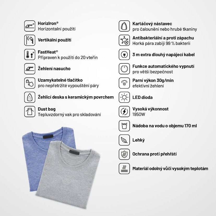 Nie je čas strácať čas, preto je tu technológia FastHeat®. Vďaka nej je prístroj schopný akcie do 20 sekúnd od zapnutia, nech ste kdekoľvek. Niekedy jednoducho nie je po ruke vešiak alebo je plocha tak veľká, že klasické žehlenie je nepraktické. Potom prichádza technológia HorizIron®, s ktorou dosiahnete dokonalé výsledky aj horizontálnym naparovaním či žehlením nasucho.