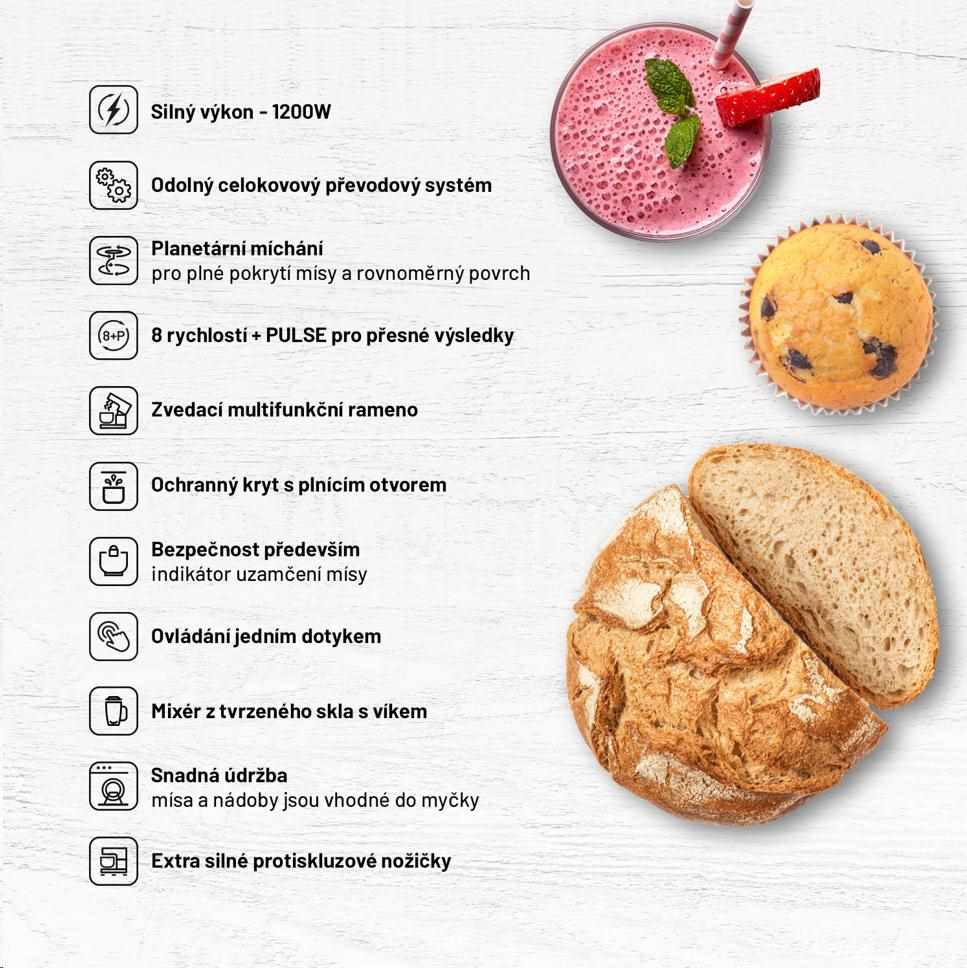 Vďaka špeciálnemu 3D planetárnemu mixovaciemu pohybu dosiahne nadstavec na celú misu, na dno i do strán, a zaistí rovnomerný výsledok.