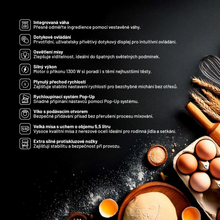 Kuchynského robota využijete nielen pri príprave cesta, ale jeho bohaté príslušenstvo umožňuje aj mixovať, strúhať či mlieť. V balení preto nájdete sklenený mixér, strúhadlo na zeleninu, mlynček na mäso či výrobník klobás a všetko príslušenstvo vymeníte veľmi ľahko pomocou zdvíhacieho ramena s pop-up systémom. Prostredníctvom prémiového dotykového displeja máte všetky procesy pod kontrolou, jednoducho nastavíte rýchlosť a všetko potrebné.