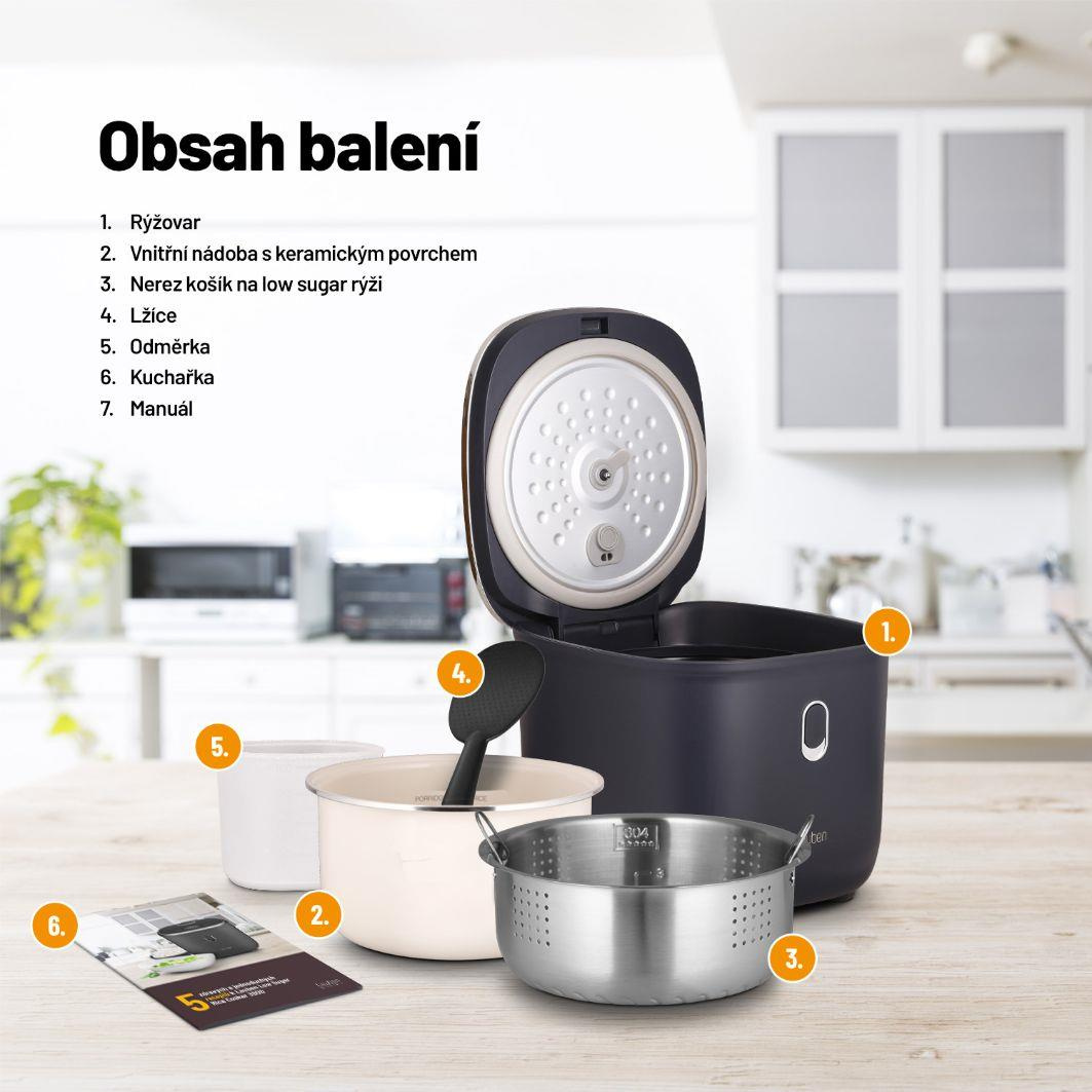 Zbaví vás až 40 % sacharidov v ryžiAk chcete jesť zdravšie, multiúčelový ryžovar Lauben Low Sugar Rice Cooker 3000AT by vám nemal chýbať. Jeho funkcia low sugar odstráni až 40 % sacharidov z ryže. Prístroj si poradí so všetkými druhmi ryže, ale aj s ďalšími ingredienciami, napríklad strukovinami. Môžete si vybrať zo 6 režimov, ktoré je však možné ručne upraviť. Prémiový neprilnavý keramický povrch jeho 3l nádoby pripraví jedlo pre celú rodinu bez potreby používania tuku a obáv z pripálenia. Teší sa z funkcie Keep Warm, ktorá udrží pokrmy teplé bez rizika rozvarenia, odloženého štartu alebo ochrany proti pretečeniu a technológie Cool Touch, vďaka ktorej sa nepopálite o ryžovar. Dotykové tlačidlá uľahčujú nastavenie ryžovaru. Jednoduchá údržba je samozrejmosťou, stačí vložiť vnútornú časť do umývačky. Ako inšpiráciu sme pridali aj kuchárku.