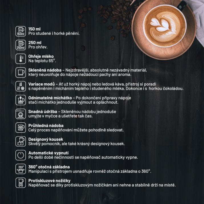 Napäňovač mlieka disponuje širokým spektrom rôznych režimov, ktoré zabezpečujú teplé aj studené napäňovanie alebo miešanie. Svoj obľúbený nápoj si tak vychutnáte v klasickej teplej verzii, ale aj v horúcich dňoch v ľadovej variante. Špeciálny režim pre čokoládu poteší najmä deti. Počas chvíle pripravíte mlieko rovno pre niekoľko šálok, pretože kapacita nádoby je určená pre ohrev 250 ml a napenenie 150 ml mlieka. Vďaka tichému prevádzku to zvládnete bez prebudenia rodiny alebo rušenia kolegov v susednej kancelárii.