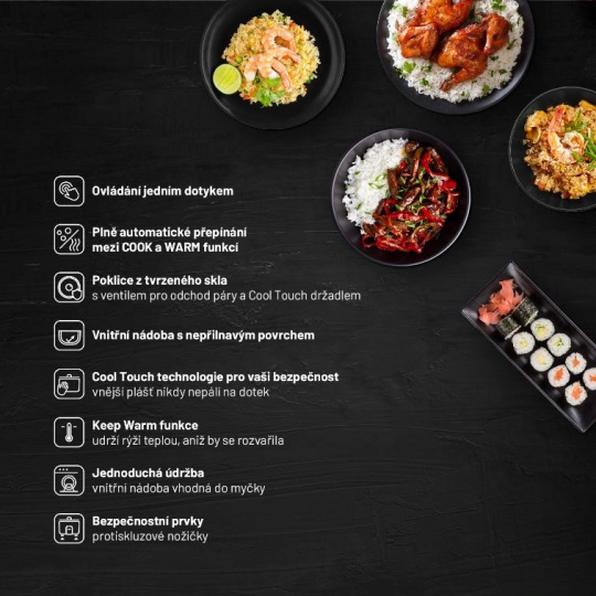 Ryžovar tvorí nádoba o objeme 1 liter s neprilnavým povrchom. Príprava pokrmov tak nevyžaduje žiadny pridaný tuk, a predsa sa ryža ani ostatné suroviny nikdy neprichyte. Veľkou výhodou je funkcia Keep warm, ktorá udrží ryžu teplú pokojne celý deň. Ryžovar sa do tohto režimu prepne automaticky, akonáhle skončí proces varenia.