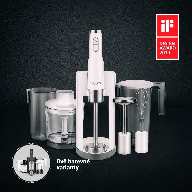 Lauben Stick Blender je príklad dômyslenej kombinácie funkčného a štýlového dizajnu, za ktorý mu právom patrí prestížne ocenenie IF Design. Nie len, že dobre vyzerá, ale vďaka ergonomickému tvaru a protišmykovej úprave sa s ním veľmi ľahko manipuluje a dobre sa drží. Telo mixéru je zároveň dostatočne robustné, takže nad ním máte úplnú kontrolu. Oceníte aj praktický stojan, do ktorého umiestnite všetky nástavce. Mixér vám v kuchyni nebude zaberať veľa miesta a vaše kuchynské skríňky zostanú upratané. Na výber máte zo dvoch farebných variánt.