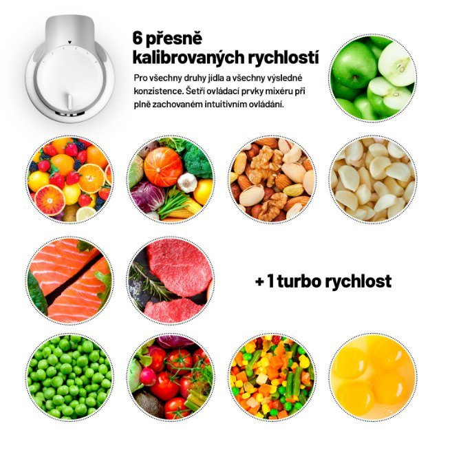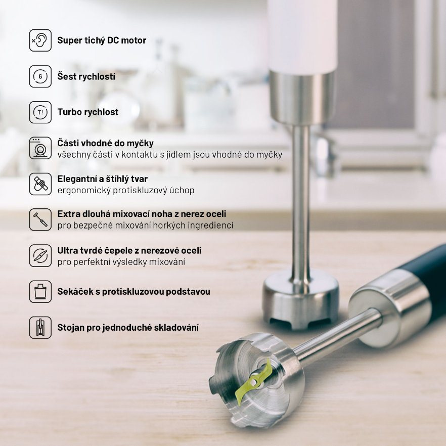Ovládanie tyčového mixéru zvládne úplne každý. Na výber máte zo 6 rýchlostí, samozrejmosťou je aj funkcia TURBO. Mixovacia nástavca má extra dlhú nohu, takže môžete bez problémov mixovať aj horúce ingrediencie. Všetci poznáme situáciu, keď mixované ingrediencie zo nádoby vystrekne a vy nielenže prídete o polievku na večeru, ale navyše môžete znovu maľovať kuchyňu. S naším mixérom sa vám toto nestane, pretože sme hlavicu vytvarovali tak, aby k nechcenému rozstreku potravín nedošlo. Počas domácich osláv preto nemusíte obliekať zástery ani pri výrobe koktejlov pre hostí. Určite vás tiež poteší, že všetky nástavce môžu byť umývané v umývačke riadu.