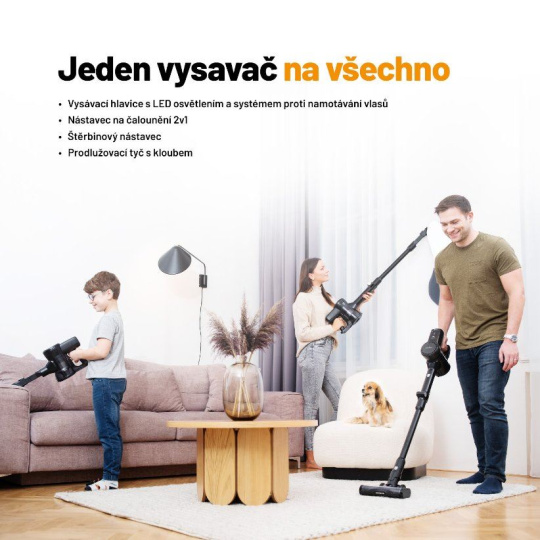 Univerzálny motorizovaný kefka je vhodný pre všetky druhy podláh vrátane tých, na ktorých sa pohybujú domáci maznáčikovia. Nielen ich chlpy bezpečne odstráni hlavica so systémom proti zamotávaniu vlasov. Uľahčuje upratovanie flexibilná tyč s kĺbom a zbieracia nádoba umiestnená v hornej časti, takže vysávač sa ľahko dostane aj pod nábytok a do úzkych priestorov. Vďaka prevedeniu bez káblov a možnosti premeny na ručný vysávač je možné ho použiť kdekoľvek, napríklad pri čistení auta. Vydrží až 35 minút na jedno nabitie.