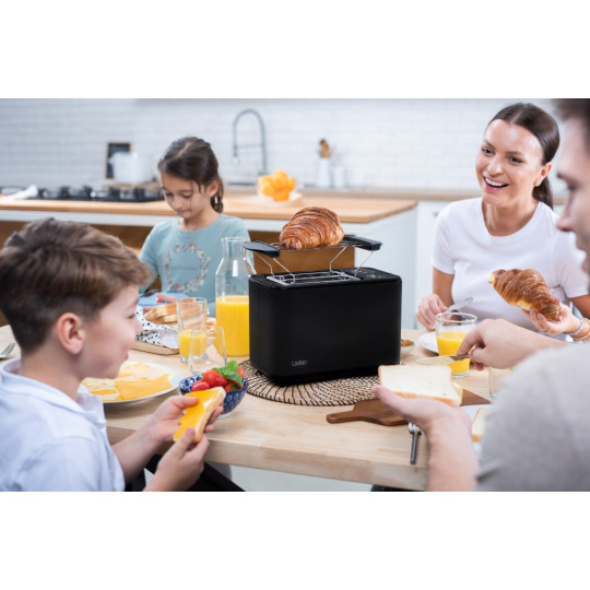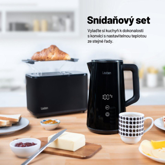 Chrumkavý toast na raňajky natretý maslom predstavuje pre mnohých dokonalý začiatok dňa. S Lauben Toaster 900BC získajú vaše raňajky či desiaty úplne nový rozmer, vďaka digitálnemu nastaveniu na dotykovom displeji máte na výber zo 7 stupňov intenzity opečenia. Dokonca si môžete uložiť svoj obľúbený stupeň opečenia. Ak si nie ste istí, ako moc opekať, proces môžete kedykoľvek manuálne ukončiť. A ak sa stane, že toast trochu vychladne, môžete si ho prehriať funkciou Reheat. Rýchle je aj rozpiekanie pečiva, keď stačí dať obľúbený croissant na ohrevnú mriežku, zapnúť a je ako z pekárne. Pomocou funkcie Defrost môžete všetko ľahko rozmraziť. Údržba topinkovača nie je zložitá, stačí vybrať táck na drobky a vysypať. Vylepšenú kuchynskú linku získate s varnou konvicou v rovnakom dizajne.