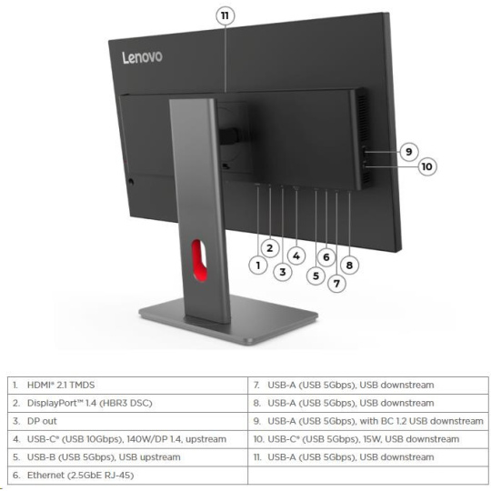 | USB port | 1x USB-C (USB 10Gbps,DP 1.4 Alt Mode HBR3, PD3.1 140W, USB upstream), 1x USB-B (USB 5Gbps, USB upstream), 3x USB-A (USB 5Gbps, USB downstream), 1x USB-A (USB 5Gbps, s BC1.2, USB downstream), 1x USB-C (USB 5Gbps, 15WPD, USB downstream) |