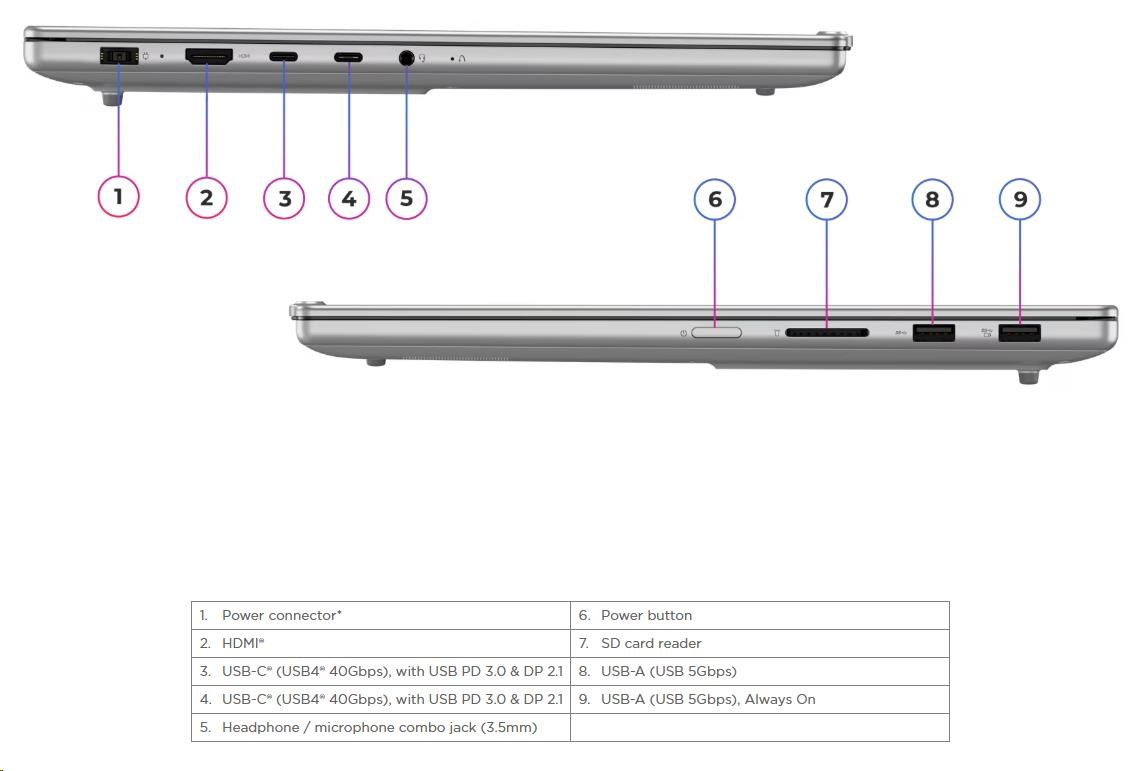 | Standartné porty | 1x USB-A (USB 5Gbps / USB 3.2 Gen 1) 1x USB-A (USB 5Gbps / USB 3.2 Gen 1), Always On 2x USB-C® (USB4® 40Gbps), with USB PD 3.0 and DisplayPort™ 2.1 1x HDMI® 2.1, up to 8K/60Hz 1x Headphone / microphone combo jack (3.5mm) 1x SD card reader 1x Power Connector |