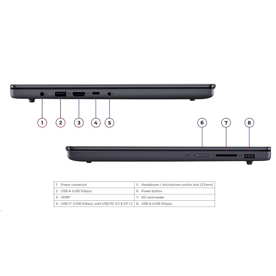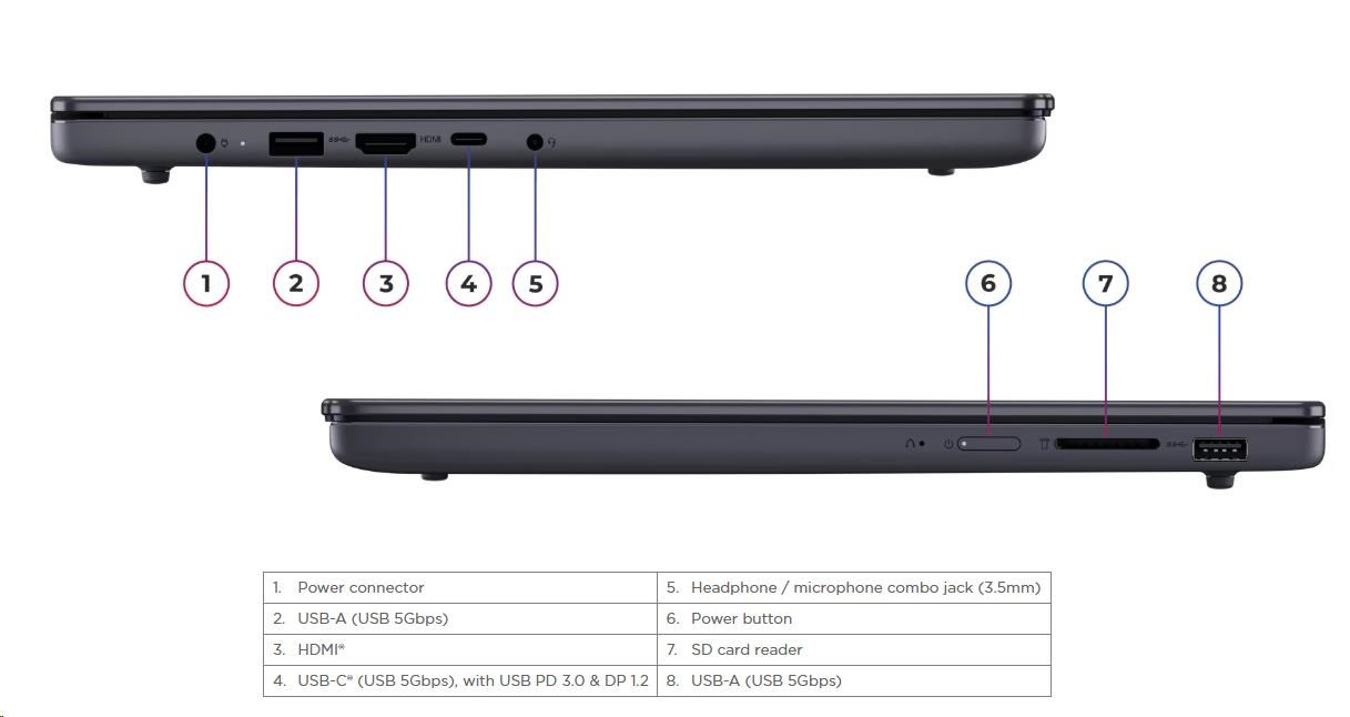 | Standartné porty | 2x USB-A (USB 5Gbps / USB 3.2 Gen 1) 1x USB-C® (USB 5Gbps / USB 3.2 Gen 1), with USB PD 3.0 and DisplayPort™ 1.2 1x HDMI® 1.4 1x Headphone / microphone combo jack (3.5mm) 1x SD card reader 1x Power connector |