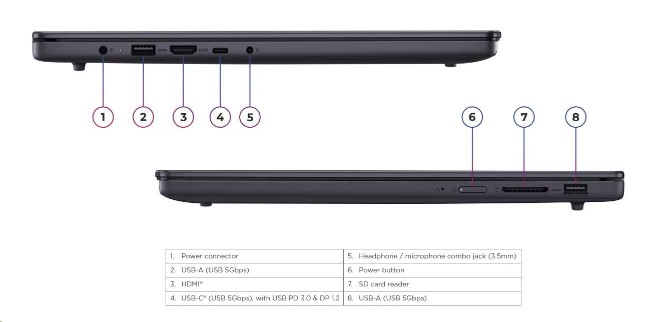 | Standartné porty | 2x USB-A (USB 5Gbps / USB 3.2 Gen 1) 1x USB-C® (USB 5Gbps / USB 3.2 Gen 1), with USB PD 3.0 and DisplayPort™ 1.2 1x HDMI® 1.4 1x Headphone / microphone combo jack (3.5mm) 1x SD card reader 1x Power connector |