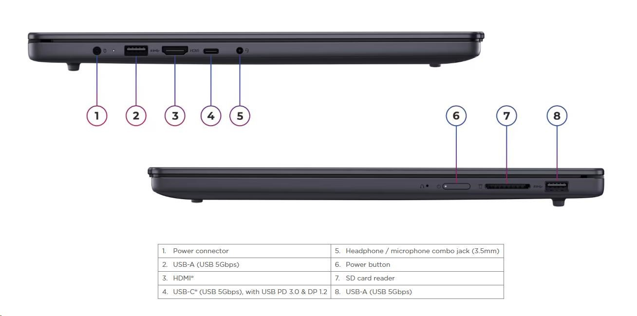 | Standartné porty | 2x USB-A (USB 5Gbps / USB 3.2 Gen 1) 1x USB-C® (USB 5Gbps / USB 3.2 Gen 1), with USB PD 45-65W and DisplayPort™ 1.2 1x HDMI® 1.4 1x Headphone / microphone combo jack (3.5mm) 1x SD card reader 1x Round tip power connector |