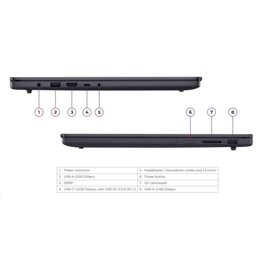 | Standartné porty | 2x USB-A (USB 5Gbps / USB 3.2 Gen 1) 1x USB-C® (USB 5Gbps / USB 3.2 Gen 1), with USB PD 3.0 and DisplayPort™ 1.2 1x HDMI® 1.4 1x Headphone / microphone combo jack (3.5mm) 1x SD card reader 1x Power connector |