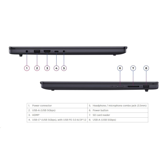 | Standartné porty | 2x USB-A (USB 5Gbps / USB 3.2 Gen 1) 1x USB-C® (USB 5Gbps / USB 3.2 Gen 1), with USB PD 3.0 and DisplayPort™ 1.2 1x HDMI® 1.4 1x Headphone / microphone combo jack (3.5mm) 1x SD card reader 1x Power connector |