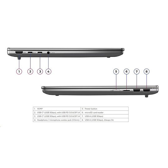 | Standartné porty | 1x USB-A (USB 5Gbps / USB 3.2 Gen 1) 1x USB-A (USB 5Gbps / USB 3.2 Gen 1), Always On 2x USB-C® (USB 5Gbps / USB 3.2 Gen 1), with USB PD 3.0 and DisplayPort™ 1.4 1x HDMI® 2.1, up to 4K/60Hz 1x Headphone / microphone combo jack (3.5mm) 1x microSD card reader |