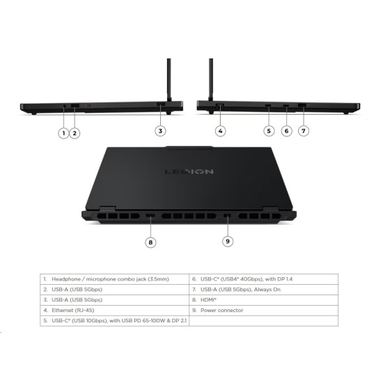 | Standartné porty | 2x USB-A (USB 5Gbps / USB 3.2 Gen 1) 1x USB-A (USB 5Gbps / USB 3.2 Gen 1), Always On 1x USB-C® (USB 10Gbps / USB 3.2 Gen 2), with USB PD 65-100W and DisplayPort™ 2.1 1x USB-C® (USB4® 40Gbps), with DP 1.4 1x HDMI® 2.1, up to 8K/60Hz 1x Headphone / microphone combo jack (3.5mm) 1x Ethernet (RJ-45) 1x Power connector |