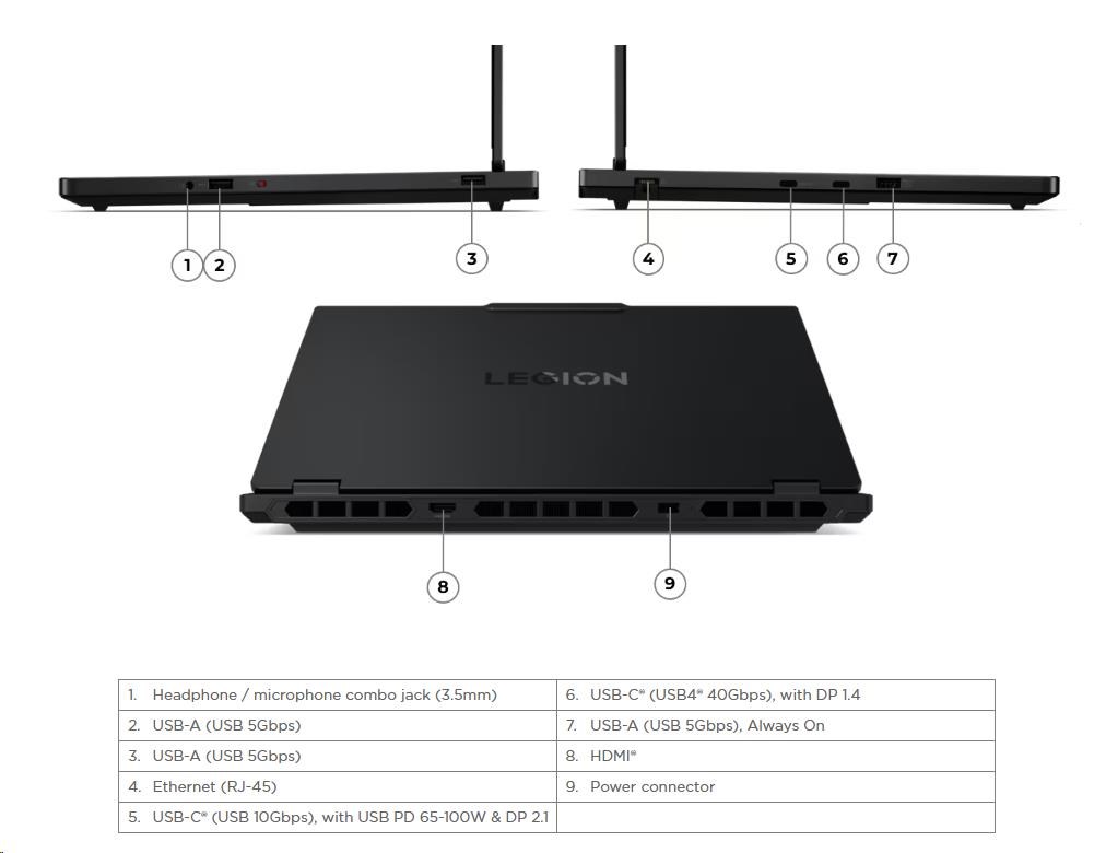 | Standartné porty | 2x USB-A (USB 5Gbps / USB 3.2 Gen 1) 1x USB-A (USB 5Gbps / USB 3.2 Gen 1), Always On 1x USB-C® (USB 10Gbps / USB 3.2 Gen 2), with USB PD 65-100W and DisplayPort™ 2.1 1x USB-C® (USB4® 40Gbps), with DP 1.4 1x HDMI® 2.1, up to 8K/60Hz 1x Headphone / microphone combo jack (3.5mm) 1x Ethernet (RJ-45) 1x Power connector |