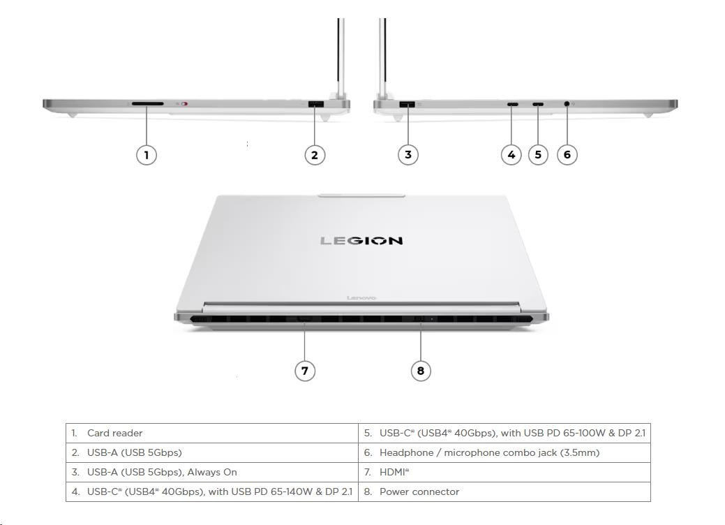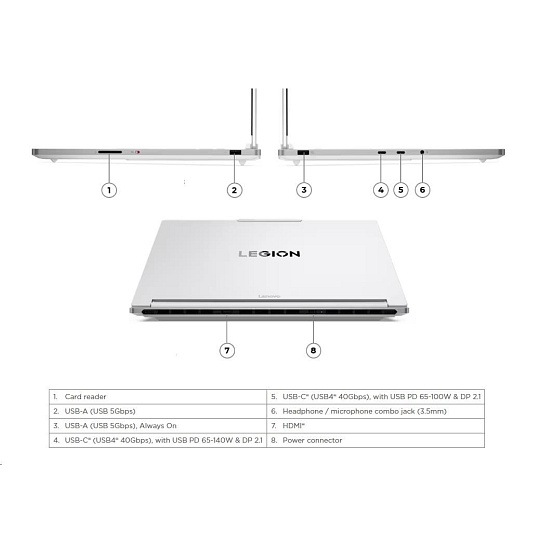 | Standartné porty | 1x USB-A (USB 5Gbps), Always On 1x USB-A (USB 5Gbps) 1x USB-C® (USB4® 40Gbps), with USB PD 65-140W and DisplayPort™ 2.1 1x USB-C® (USB4® 40Gbps), with USB PD 65-100W and DisplayPort™ 2.1 1x HDMI® 2.1, up to 8K/60Hz 1x Headphone / microphone combo jack (3.5mm) 1x Card reader 1x Slim tip Power connector |