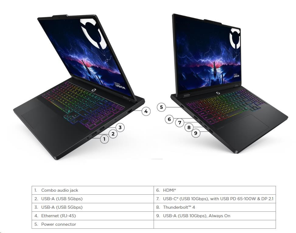 | Standartné porty | 2x USB-A (USB 5Gbps / USB 3.2 Gen 1) 1x USB-A (USB 10Gbps / USB 3.2 Gen 2), Always On 1x USB-C® (USB 10Gbps / USB 3.2 Gen 2), with USB PD 65-100W and DisplayPort™ 2.1 1x USB-C® (Thunderbolt™ 4 / USB4® 40Gbps), with DisplayPort™ 2.1 1x HDMI® 2.1, up to 8K/60Hz 1x Headphone / microphone combo jack (3.5mm) 1x Ethernet (RJ-45) 1x Power connector |