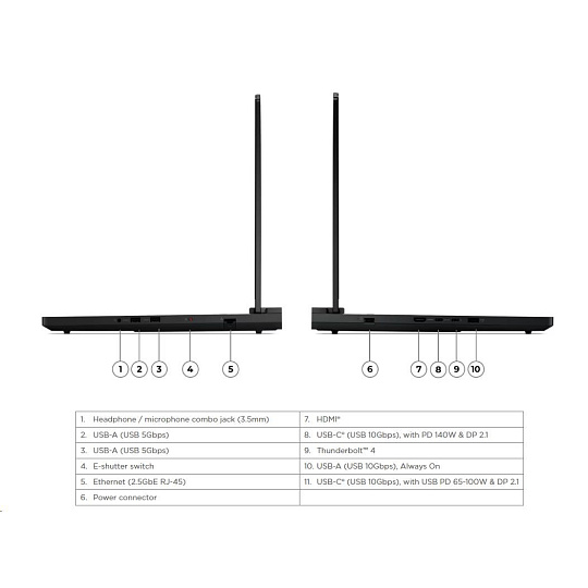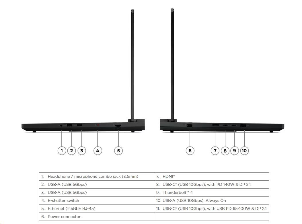 | Standartné porty | 2x USB-A (USB 5Gbps / USB 3.2 Gen 1) 1x USB-A (USB 10Gbps / USB 3.2 Gen 2), Always On 1x USB-C® (USB 10Gbps / USB 3.2 Gen 2), with USB PD 65-100W and DisplayPort™ 2.1 1x Thunderbolt™ 4 / USB4® 40Gbps (support data transfer and DisplayPort™ 2.1) 1x HDMI® 2.1, up to 8K/60Hz 1x Headphone / microphone combo jack (3.5mm) 1x Ethernet (2.5GbE RJ-45) 1x Power connector |
