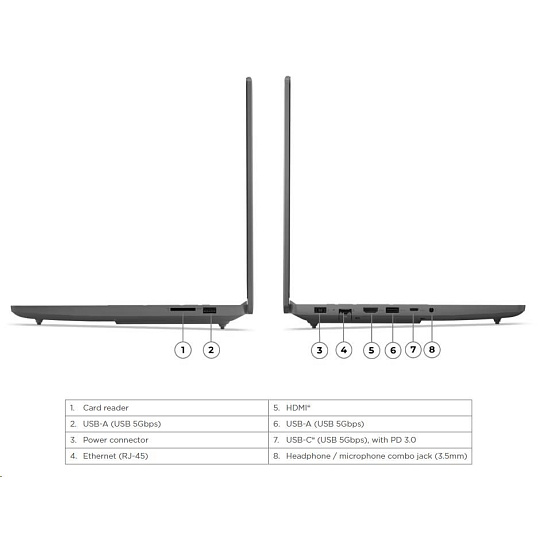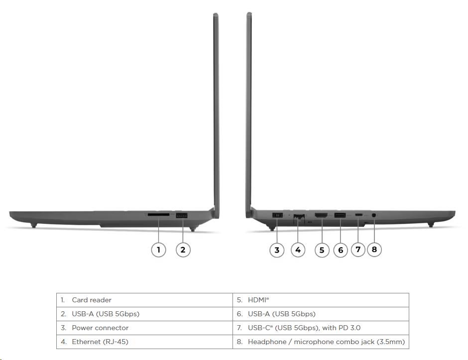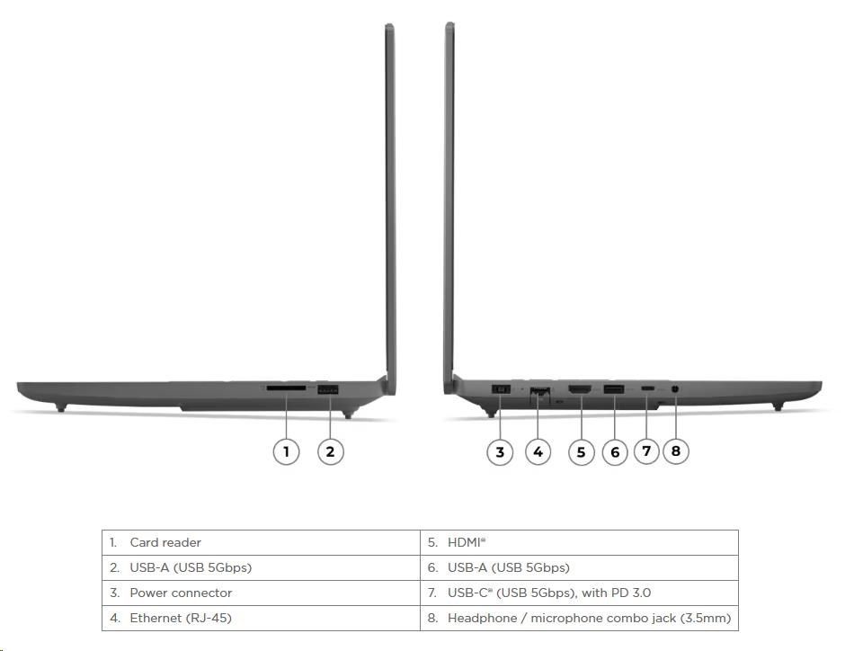 | Standartné porty | 2x USB-A (USB 5Gbps / USB 3.2 Gen 1) 1x USB-C® (USB 5Gbps / USB 3.2 Gen 1), with PD 3.0 1x HDMI® 2.1, up to 8K/60Hz 1x Headphone / microphone combo jack (3.5mm) 1x Ethernet (RJ-45) 1x Card reader 1x Slim tip Power connector |