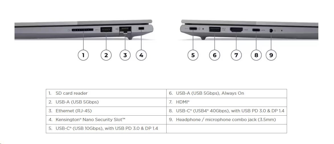 | Standartné porty | 1x USB-A (USB 5Gbps / USB 3.2 Gen 1) 1x USB-A (USB 5Gbps / USB 3.2 Gen 1), Always On 1x USB-C® (USB 10Gbps / USB 3.2 Gen 2), with USB PD 3.0 and DisplayPort™ 1.4 1x USB-C® (USB4® 40Gbps), with USB PD 3.0 and DisplayPort™ 1.4 1x HDMI® 2.1, up to 4K/60Hz 1x Headphone / microphone combo jack (3.5mm) 1x Ethernet (RJ-45) 1x SD card reader |