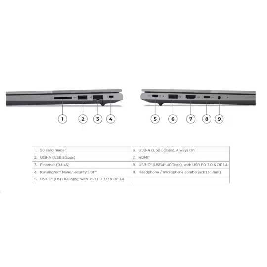 | Standartné porty | 1x USB-A (USB 5Gbps / USB 3.2 Gen 1) 1x USB-A (USB 5Gbps / USB 3.2 Gen 1), Always On 1x USB-C® (USB 10Gbps / USB 3.2 Gen 2), with USB PD 3.0 and DisplayPort™ 1.4 1x USB-C® (USB4® 40Gbps), with USB PD 3.0 and DisplayPort™ 1.4 1x HDMI® 2.1, up to 4K/60Hz 1x Headphone / microphone combo jack (3.5mm) 1x Ethernet (RJ-45) 1x SD card reader  |
