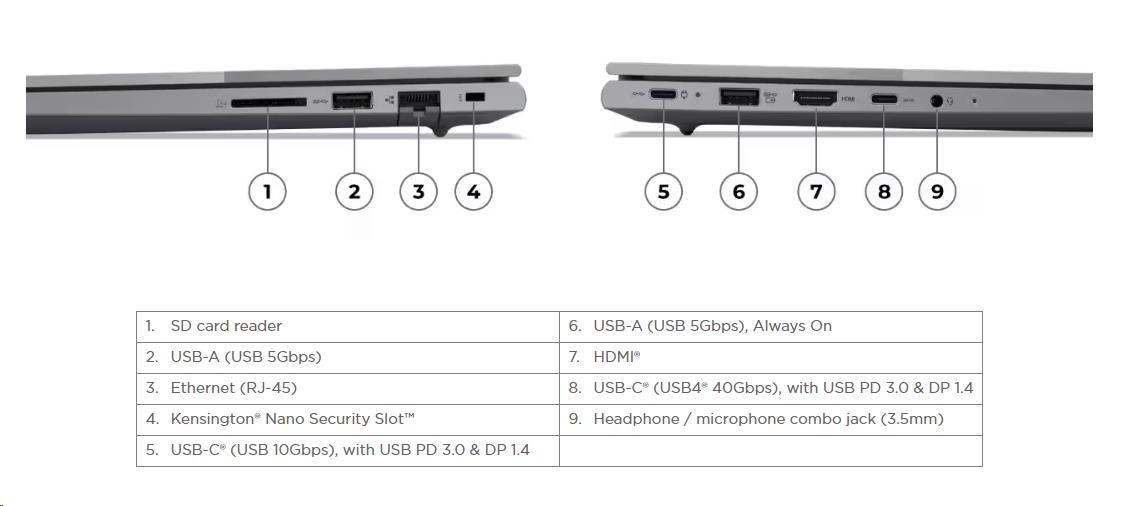 | Standartné porty | 1x USB-A (USB 5Gbps / USB 3.2 Gen 1) 1x USB-A (USB 5Gbps / USB 3.2 Gen 1), Always On 1x USB-C® (USB 10Gbps / USB 3.2 Gen 2), with USB PD 3.0 and DisplayPort™ 1.4 1x USB-C® (USB4® 40Gbps), with USB PD 3.0 and DisplayPort™ 1.4 1x HDMI® 2.1, up to 4K/60Hz 1x Headphone / microphone combo jack (3.5mm) 1x Ethernet (RJ-45) 1x SD card reader  |