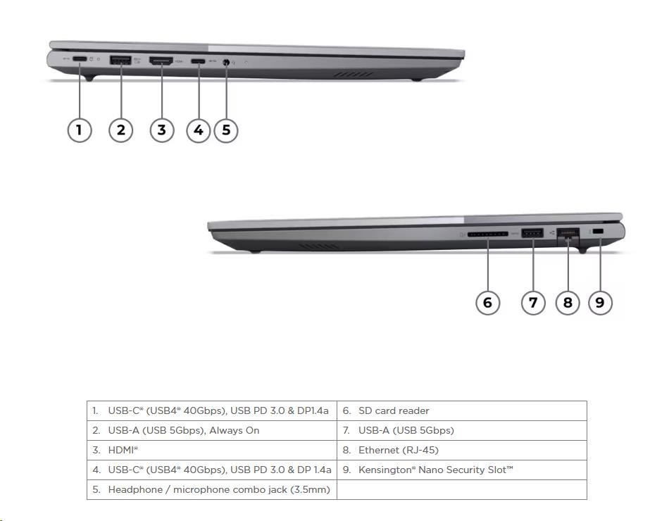 | Standartné porty | 1x USB-A (USB 5Gbps), Always On 1x USB-A (USB 5Gbps) 2x USB-C® (USB4® 40Gbps), with USB PD 3.0 and DisplayPort™ 1.4a 1x HDMI® 2.1, up to 4K/60Hz 1x Headphone / microphone combo jack (3.5mm) 1x Ethernet (RJ-45) 1x SD card reader |