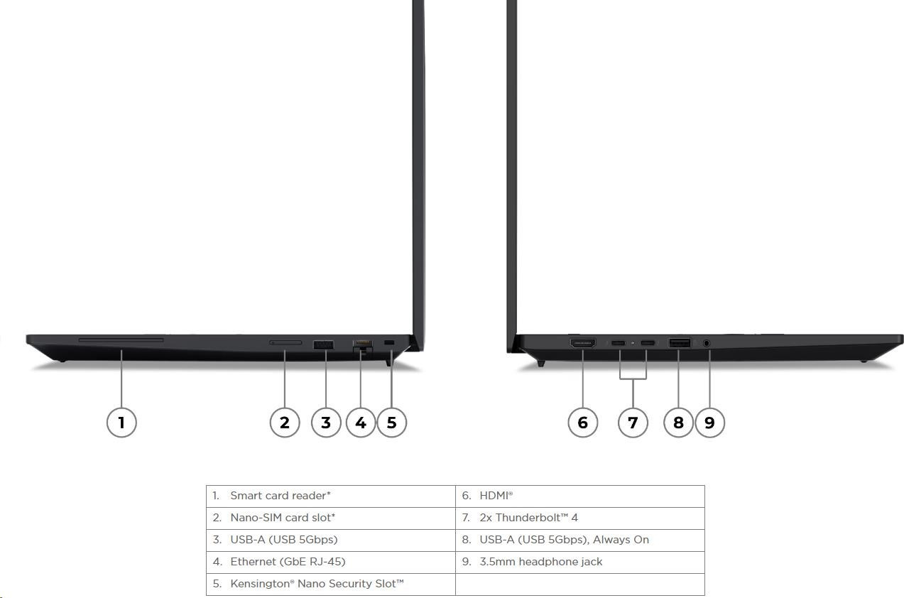 | Standartné porty | 1x USB-A (USB 5Gbps / USB 3.2 Gen 1) 1x USB-A (USB 5Gbps / USB 3.2 Gen 1), Always On 2x USB-C® (Thunderbolt™ 4 / USB4® 40Gbps), with USB PD 3.0 and DisplayPort™ 2.1 1x HDMI® 2.1, up to 4K/60Hz 1x Headphone / microphone combo jack (3.5mm) 1x Ethernet (RJ-45) 1x Security keyhole |