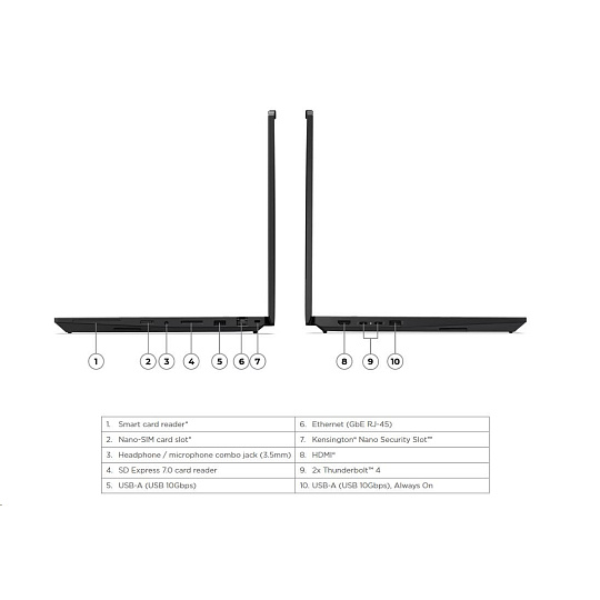 | Standartné porty | 1x USB-A (USB 10Gbps / USB 3.2 Gen 2), Always On 1x USB-A (USB 10Gbps / USB 3.2 Gen 2) 2x Thunderbolt™ 4, with USB PD 3.1, 140W input / 15W output 1x HDMI® 2.1, up to 8K/60Hz 1x Headphone / microphone combo jack (3.5mm) 1x Ethernet (GbE RJ-45) 1x SD Express 7.0 card reader 1x Security keyhole |