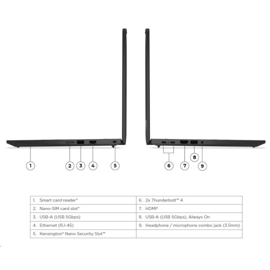 | Standartné porty | 1x USB-A (USB 5Gbps / USB 3.2 Gen 1) 1x USB-A (USB 5Gbps / USB 3.2 Gen 1), Always On 2x USB-C® (Thunderbolt™ 4 / USB4® 40Gbps), with USB PD 3.0 and DisplayPort™ 2.1 1x HDMI® 2.1, up to 4K/60Hz 1x Headphone / microphone combo jack (3.5mm) 1x Ethernet (RJ-45) 1x Smart Card Reader 1x Nano-SIM Card Slot |
