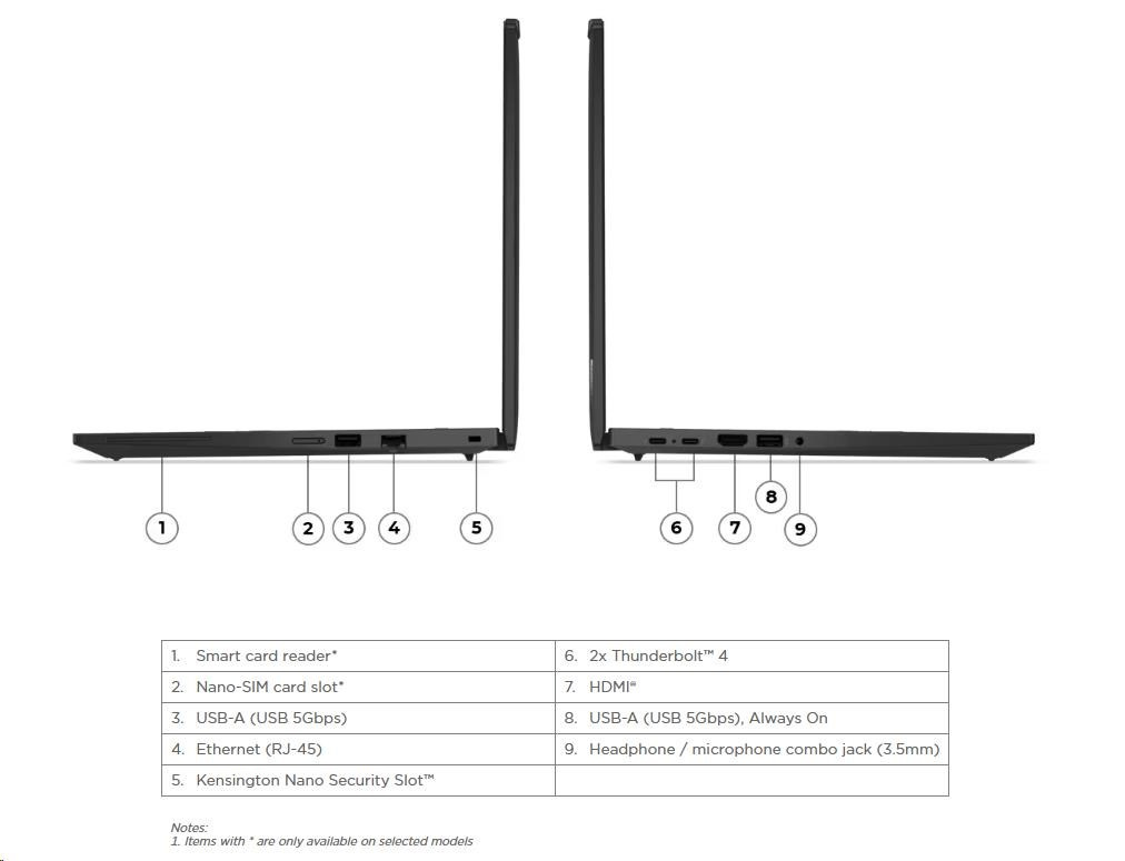 | Standartné porty | 1x USB-A (USB 5Gbps / USB 3.2 Gen 1) 1x USB-A (USB 5Gbps / USB 3.2 Gen 1), Always On 2x USB-C® (Thunderbolt™ 4 / USB4® 40Gbps), with USB PD 3.0 and DisplayPort™ 2.1 1x HDMI® 2.1, up to 4K/60Hz 1x Headphone / microphone combo jack (3.5mm) 1x Ethernet (RJ-45) Optional Ports (configured) 1x Smart Card Reader 1x Nano-SIM Card Slot |
