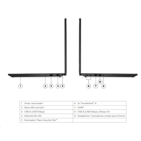 | Standartné porty | 1x USB-A (USB 5Gbps / USB 3.2 Gen 1) 1x USB-A (USB 5Gbps / USB 3.2 Gen 1), Always On 2x USB-C® (Thunderbolt™ 4 / USB4® 40Gbps), with USB PD 3.0 and DisplayPort™ 2.1 1x HDMI® 2.1, up to 4K/60Hz 1x Headphone / microphone combo jack (3.5mm) 1x Ethernet (RJ-45) |