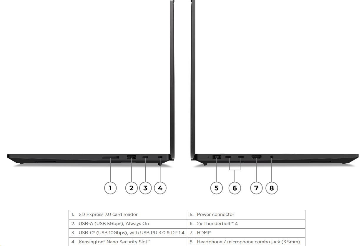 | Standartné porty | 1x USB-A (USB 5Gbps / USB 3.2 Gen 1), Always On 1x USB-C® (USB 10Gbps / USB 3.2 Gen 2), with USB PD 3.0 (135W input) and DisplayPort™ 1.4 2x USB-C® (Thunderbolt™ 4 / USB4® 40Gbps), with USB PD 3.0 (135W input) and DisplayPort™ 2.1 1x HDMI® 2.1, up to 8K/60Hz 1x Headphone / microphone combo jack (3.5mm) 1x SD Express 7.0 card reader 1x Security keyhole |