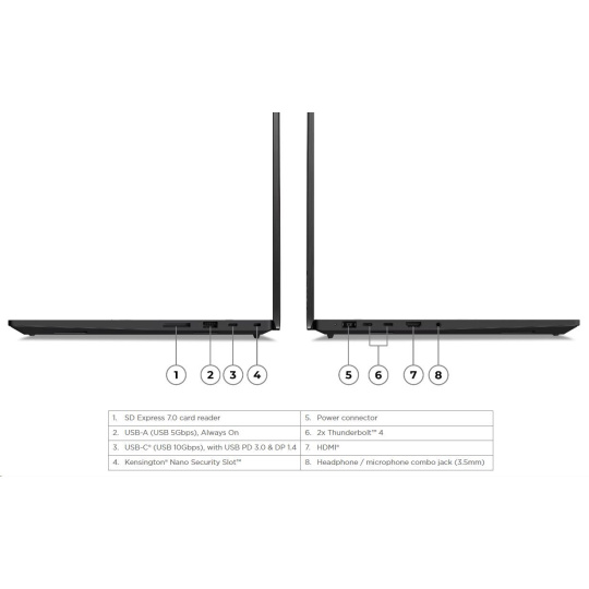 | Standartné porty | 1x USB-A (USB 5Gbps / USB 3.2 Gen 1), Always On 1x USB-C® (USB 10Gbps / USB 3.2 Gen 2), with USB PD 3.0 (135W input) and DisplayPort™ 1.4 2x USB-C® (Thunderbolt™ 4 / USB4® 40Gbps), with USB PD 3.0 (135W input) and DisplayPort™ 2.1 1x HDMI® 2.1, up to 8K/60Hz 1x Headphone / microphone combo jack (3.5mm) 1x SD Express 7.0 card reader 1x Security keyhole |