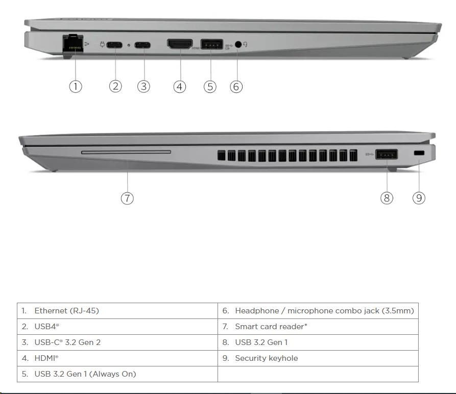 | Standartné porty | 2x USB 3.2 Gen 1 (one Always On) 1x USB-C® 3.2 Gen 2 (support data transfer, Power Delivery 3.0 and DisplayPort™ 1.4) 1x USB4® 40Gbps (support data transfer, Power Delivery 3.0 and DisplayPort™ 1.4) 1x HDMI® 2.1, up to 4K/60Hz 1x Ethernet (RJ-45) 1x Headphone / microphone combo jack (3.5mm) 1x Security keyhole |