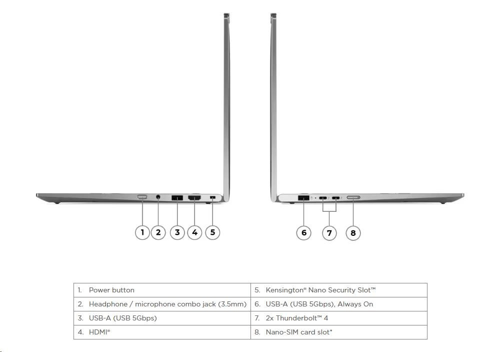 | Standartné porty | 1x USB-A (USB 5Gbps / USB 3.2 Gen 1) 1x USB-A (USB 5Gbps / USB 3.2 Gen 1), Always On 2x USB-C® (Thunderbolt™ 4 / USB4® 40Gbps), with USB PD 3.0 and DisplayPort™ 2.1 1x HDMI® 2.1, up to 4K/60Hz 1x Headphone / microphone combo jack (3.5mm) 1x Nano-SIM Card Slot |