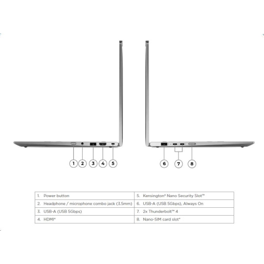 | Štandardné porty | 1x USB-A (USB 5Gbps / USB 3.2 Gen 1) 1x USB-A (USB 5Gbps / USB 3.2 Gen 1), Always On 2x USB-C® (Thunderbolt™ 4 / USB4® 40Gbps), s USB PD 3.0 a DisplayPort™ 2.1 1x HDMI® 2.1, až 4K/60Hz 1x slúchadlový / mikrofónový combo jack (3,5 mm) |