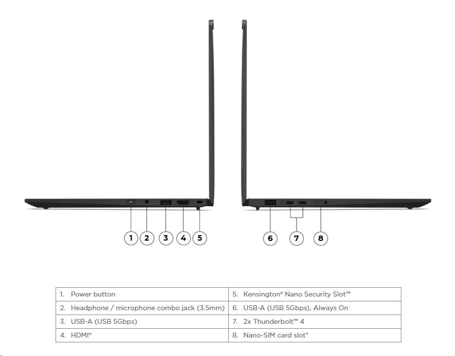 | Standartné porty | 1x USB-A (USB 5Gbps / USB 3.2 Gen 1) 1x USB-A (USB 5Gbps / USB 3.2 Gen 1), Always On 2x USB-C® (Thunderbolt™ 4 / USB4® 40Gbps), with USB PD 3.0 and DisplayPort™ 2.1 1x HDMI® 2.1, up to 4K/60Hz 1x Headphone / microphone combo jack (3.5mm) |
