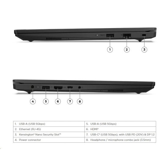| Standardní porty | 2x USB-A (USB 5Gbps / USB 3.2 Gen 1) 1x USB-C® (USB 5Gbps / USB 3.2 Gen 1), with USB Power Delivery (20V only) and DisplayPort™ 1.2 1x HDMI® 1.4b 1x Headphone / microphone combo jack (3.5mm) 1x Ethernet (RJ-45) 1x Power connector |
