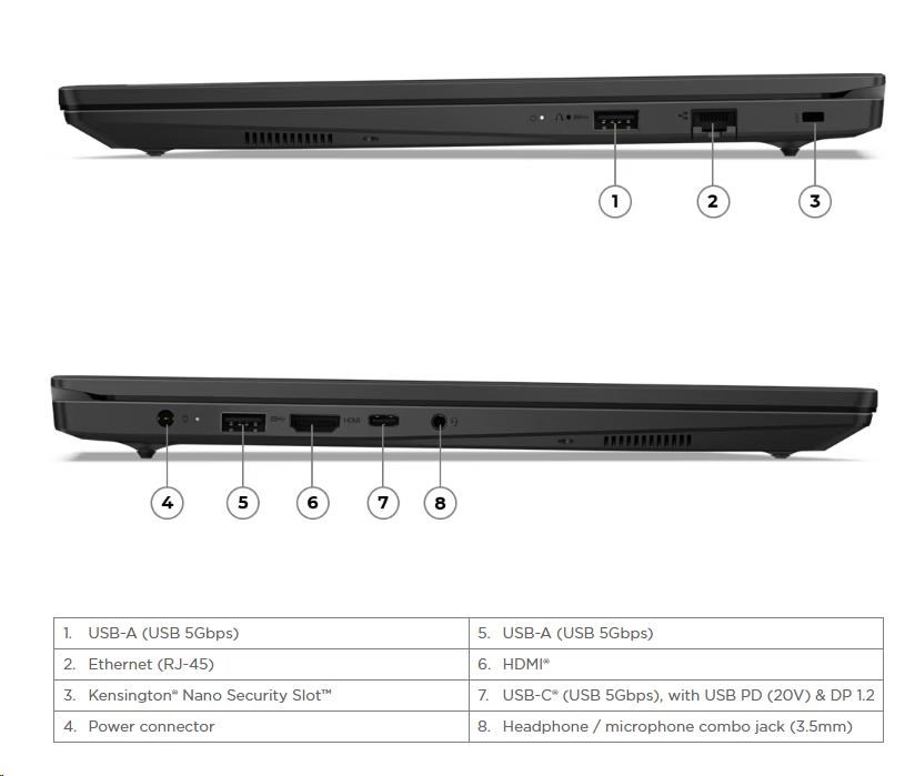 | Standardní porty | 2x USB-A (USB 5Gbps / USB 3.2 Gen 1) 1x USB-C® (USB 5Gbps / USB 3.2 Gen 1), with USB Power Delivery (20V only) and DisplayPort™ 1.2 1x HDMI® 1.4b 1x Headphone / microphone combo jack (3.5mm) 1x Ethernet (RJ-45) 1x Power connector  |