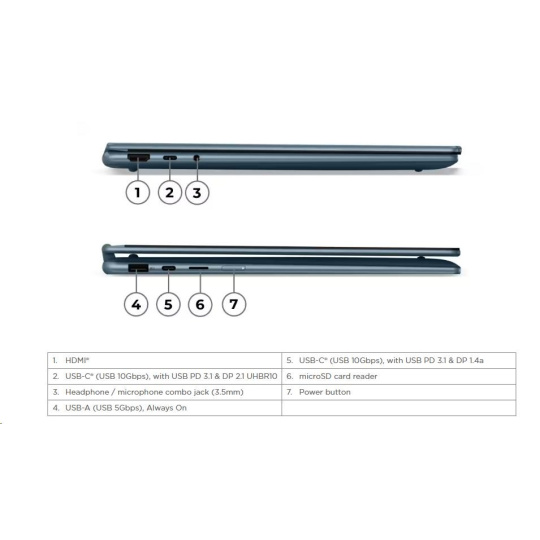 | Standartné porty | 1x USB-A (USB 5Gbps / USB 3.2 Gen 1), Always On 1x USB-C® (USB 10Gbps / USB 3.2 Gen 2), with USB PD 3.1 and DisplayPort™ 2.1 UHBR10 1x USB-C® (USB 10Gbps / USB 3.2 Gen 2), with USB PD 3.1 and DisplayPort™ 1.4a 1x HDMI® 2.1, up to 4K/60Hz 1x Headphone / microphone combo jack (3.5mm) 1x microSD card reader |