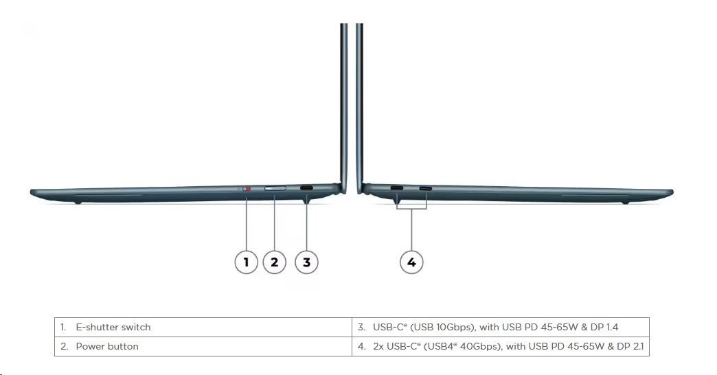 | Standartné porty | 1x USB-C® (USB 10Gbps), with USB PD 45-65W and DisplayPort™ 1.4 2x USB-C® (USB4® 40Gbps), with USB PD 45-65W and DisplayPort™ 2.1 |